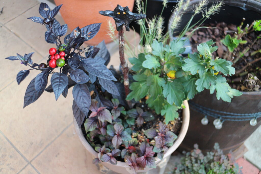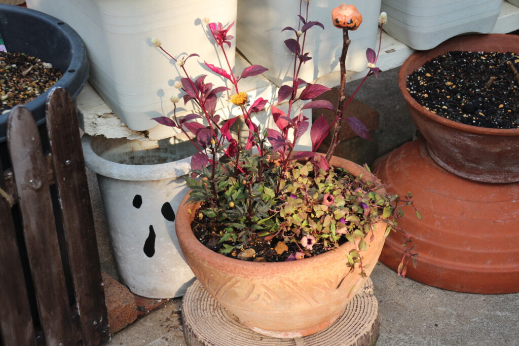 Uncategorized パンプキン 西側の庭 乾きが少なくなったきて 鉢だけ水まき トレリスはこんな感じに お店用にパンプキンを作る もっと縦長にしたかった 登録した画面に 黒いカボチャが写っていて 良いなと思い追加で作る 外の寄せ植え 空気の色も変わってきて 落ち着いてきた こんな感じに寄せ飢えた