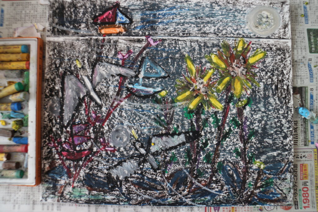 Uncategorized お絵かき お日様が 飛んできてピッ とまってる 今日は75%雨だと昨日見たけど 晴天 土はカラカラ 明日は降るかな モン ママチェック 色形 好き 絵を書こうと思う モデルさんにする クレヨンは手の勢いで描けるから好き ただ 色を重ねると取れちゃう 先ほどの寄せて植えてあるお花の絵 そして一句 ピカピカで 握れそうでも 広がって 心 コンコン 目、つかまれる