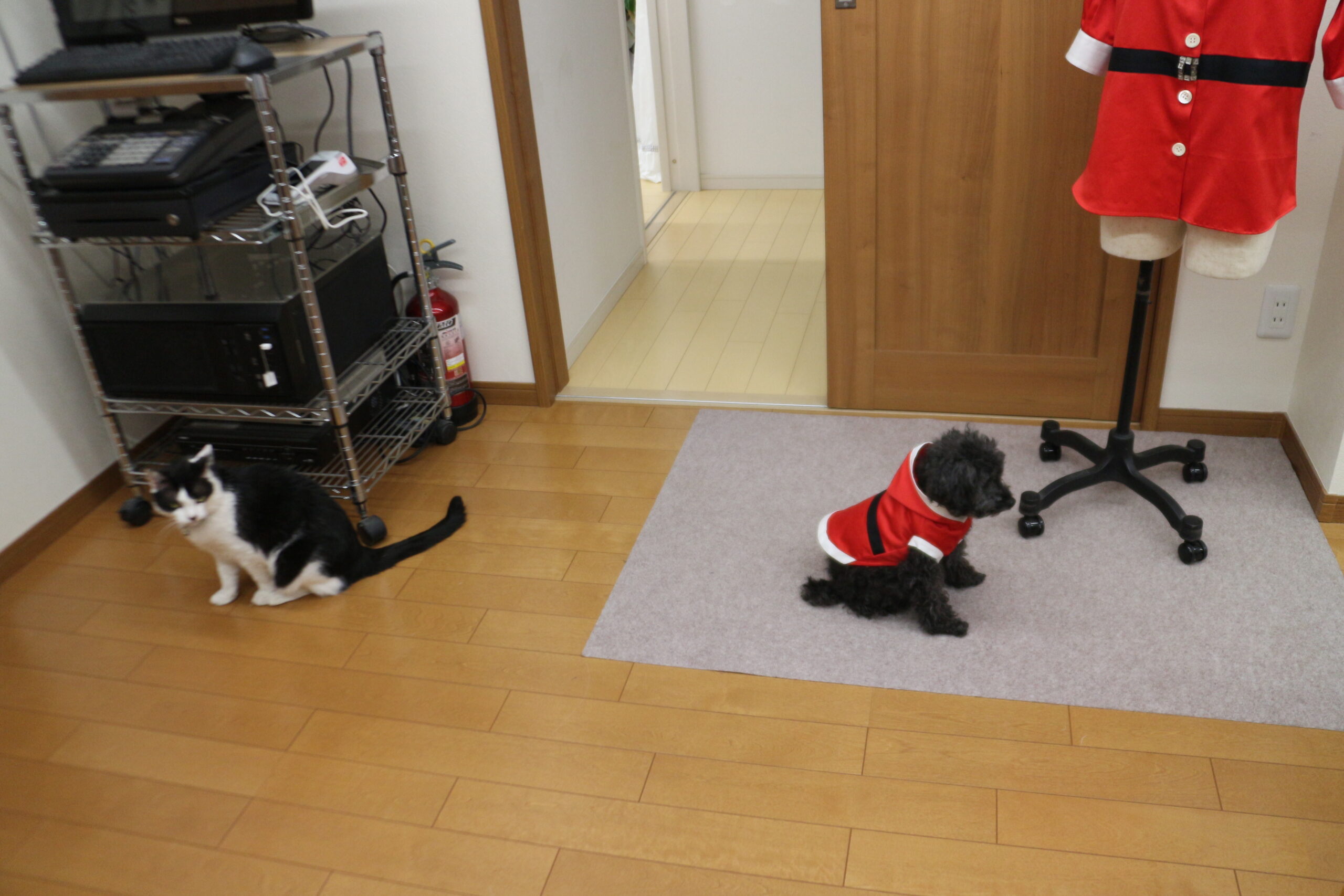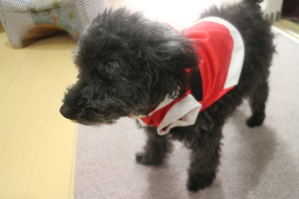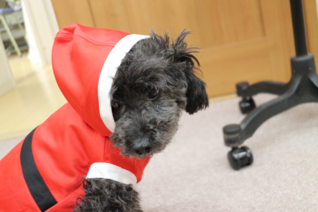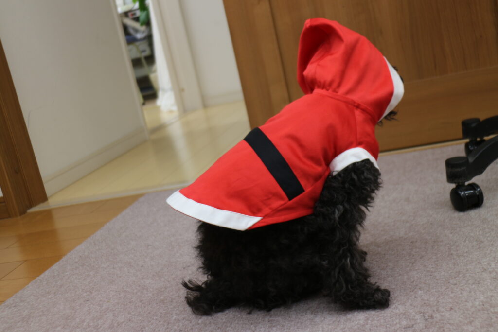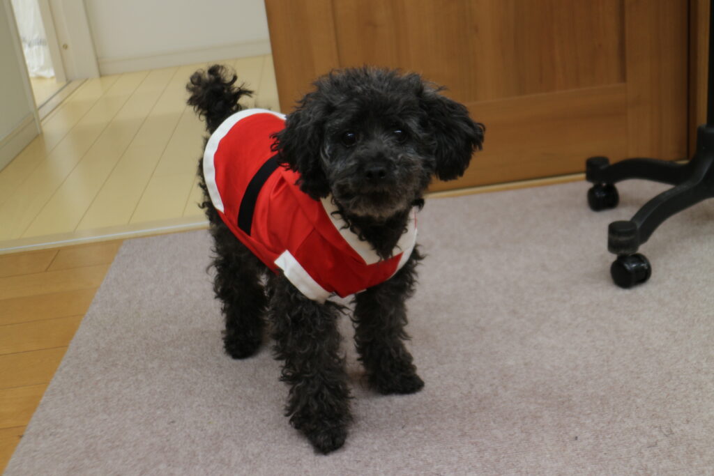 Uncategorized サンタグッズ 頂いたお菓子 サンタグッズを用意してる 片付けていたら リリ君が家に来た時に買ったパターンが出てきた 布で作るから伸びないから 入らない想定で作ってみる そのままカットなので楽 平面でみると大きくて入りそうだけど 袖が小さな輪だから腕がどうなるか ベルトを付けて 白い布で色取りをして 入らない 前開きを作ることになった 思いがけずボタンがアクセントになった 普段めんどくさいから着せていないけど りりィ君は着る気満々だった 今日はカット&シャワーしたからキレイになって年越しの準備も整った イヴは近所を着て歩くんだぁ 普段おばちゃん達に「トイプーは服着せないの?」言われてたけど 二日着せる予定